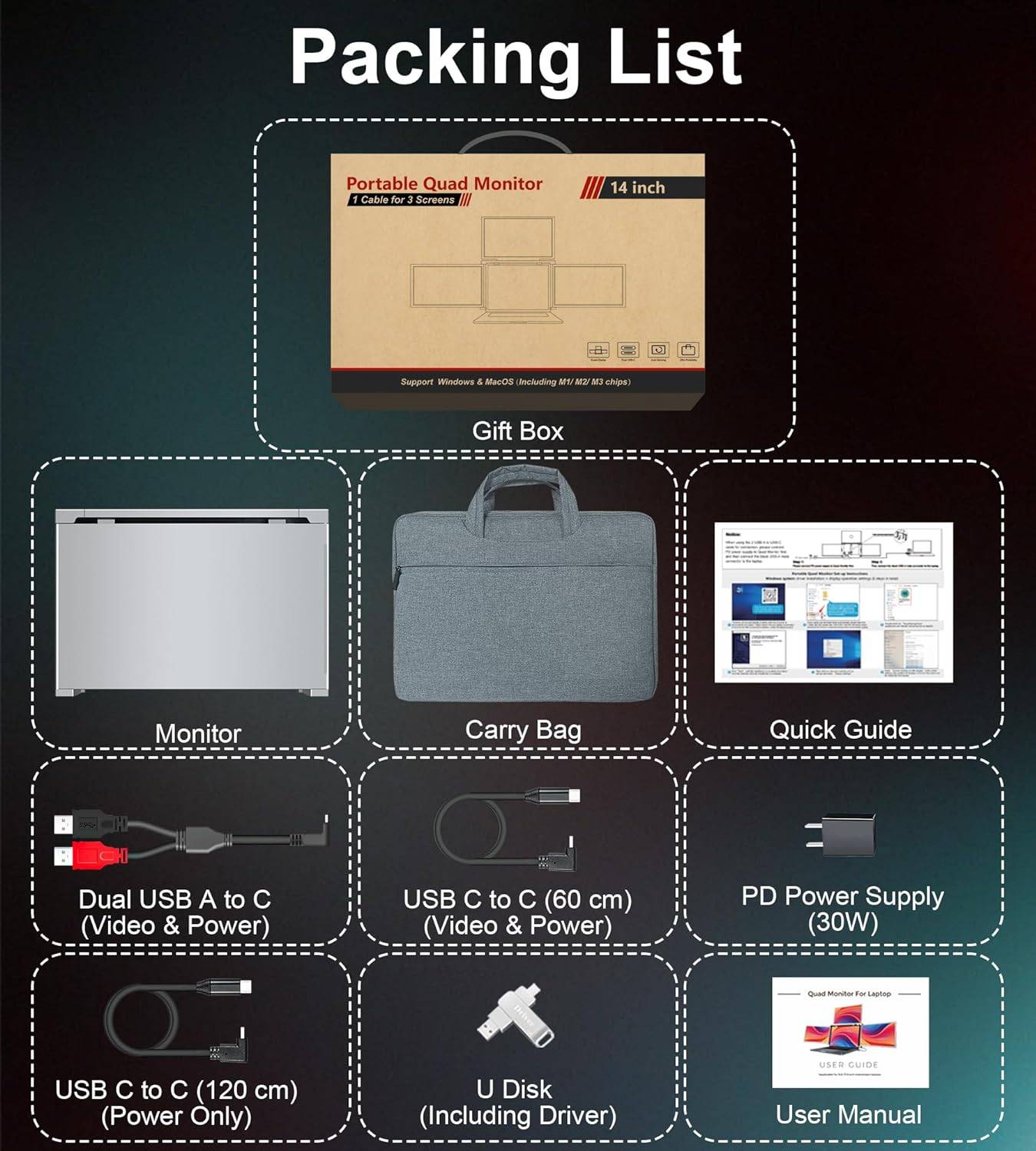 YOU WILL GET THE COMPLETE SET: 1*Exquisite packaging Box, 1*monitor, 1*power adapter, 1*Carry Bag, 1*Dual USB A to C(Video & Power), 1*USB C to C (60 cm)(Video & Power), 1*USB C to C (120 cm)(Power Only), 1*PD Power Supply(30W), 1*U Disk(lncluding Driver), 1*Quick Guide, 1*User Manual. If you are confused about compatibility and connections, please contact us. Find us on the package or in the user manual.