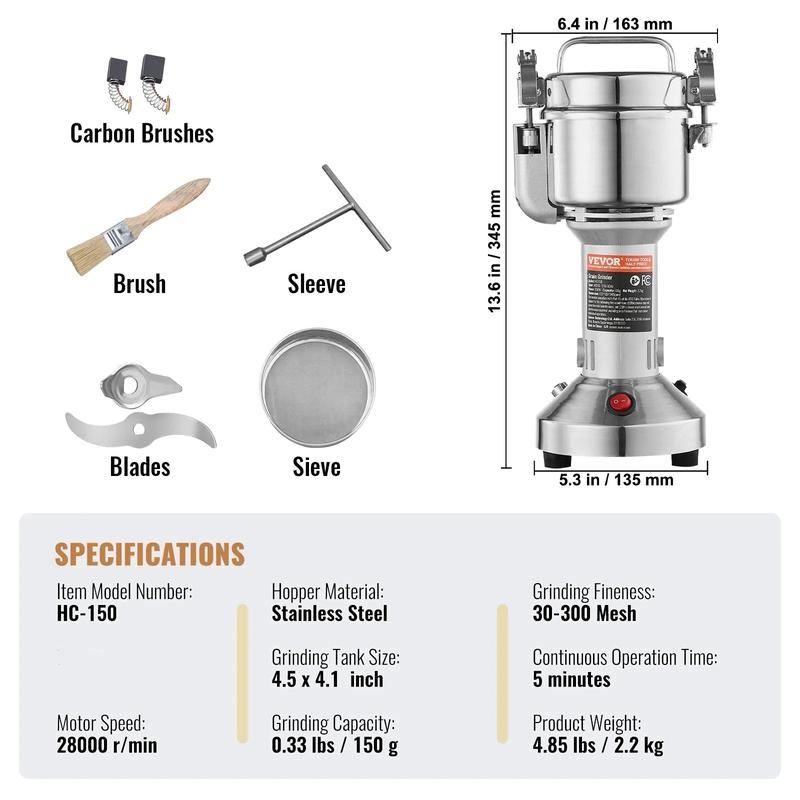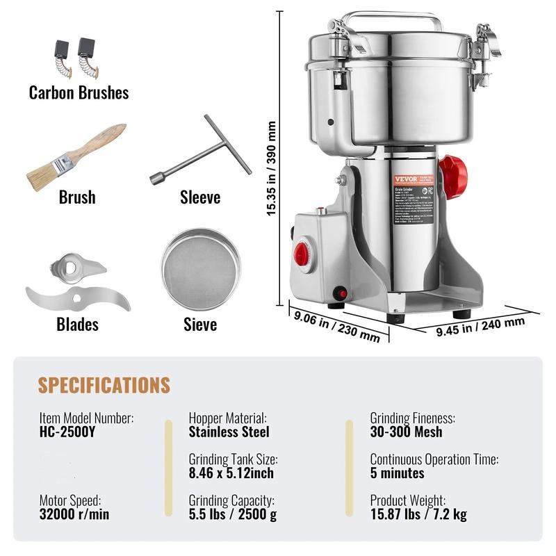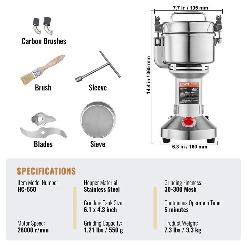 • Multipurpose Dry Grinder: The powder machine can deal with various dried materials, including ① grains (soy, corn, barley, wheat, oats, rye, peas, coffee beans), ② spices (fennel, pepper, cinnamon, rosemary) ③ others (When grinding other tough items, please first slice them into small pieces). (Not suitable for wet, fresh, oily, or sticky materials.) It is widely used in families, kitchens, hospitals, and medicine processing factories.