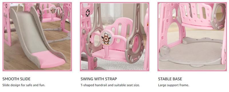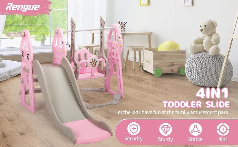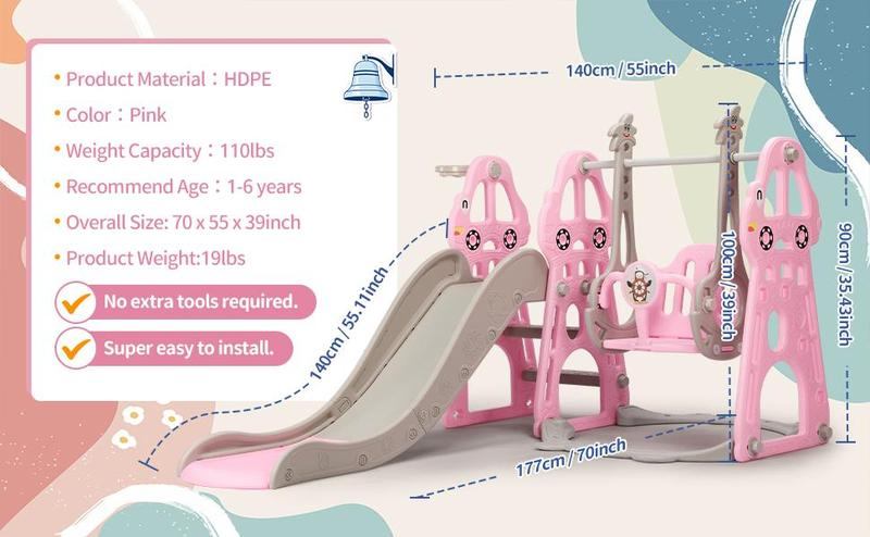Material:Plastic Brand:Rengue Product Dimensions:55"L x 70"W x 35"H Color:Pink Maximum Weight Recommendation:110 Pounds ULTIMATE TODDLER OUTDOOR PLAYSET: Experience endless fun with our 4-in-1 toddler outdoor playset, this versatile outdoor wonderland includes a smooth slide, a sturdy swing, a basketball hoop, and a climber; Watch your little ones thrive in active play, all within the safety of your backyardINDOOR PLAYGROUND EXTRAVAGANZA: Bring the joy of the indoor playground with our multifunctional playset; With a gentle slide, secure swing, interactive basketball hoop, and safe climber, your home transforms into a haven of fun and exploration for kids aged 1-6TODDLER PLAYGROUND ADVENTURE: Our toddler playground for toddlers guarantees hours of entertainment; From sliding down the gentle slope to swinging in secure seats, shooting hoops, and climbing with confidence, children embark on a journey of discovery and physical activitySAFE INDOOR PLAYGROUND FOR KIDS 1-6: Create a secure haven for your little ones with our toddler swing set Designed for ages 1-6, it features a long slide with easy steps, a stable swing with seat belts, a basketball hoop for skill development, and a climber with added safety measuresSAFE INDOOR PLAYGROUND FOR KIDS 1-6: Transform your home into a thrilling adventure zone with a toddler slide indoor slide; With its smooth surface and easy assembly, children aged 1-6 can safely enjoy endless sliding fun