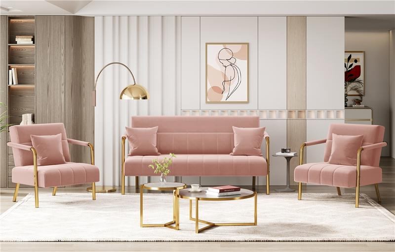 3. 【Stunning Golden Legs】This glam-style velvet sofa's gold-tone slender legs create an open and airy ambiance, adding a touch of glamour to your seating area. The integrated armrest and legs with a 1.2 mm wall thickness strengthen the seat and backrest, ensuring this couch will serve reliably for a long time.