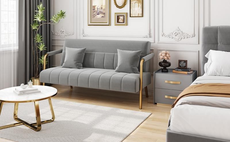 1. 【Simple Structure, Soft Materials】This small loveseat is crafted with a solid wood & manufactured wood frame, supported by sturdy, streamlined iron arms & legs, bringing exceptional stability without the bulk. The futon is finished in lush velvet fabric, giving you excellent comfort and smoothness.