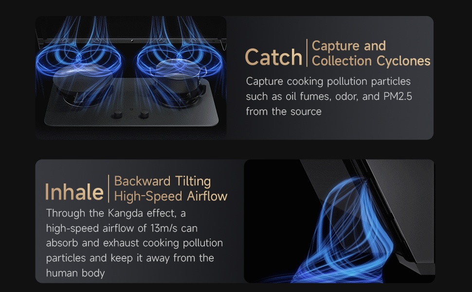 PROTECT OUR HEALTHY: IQV effectively expels harmful substances, ensuring a cleaner kitchen with minimal PM2.5 increase during cooking.And IQV technology efficiently uses energy to provide powerful smoke extraction while maintaining lower energy consumption compared to traditional models.